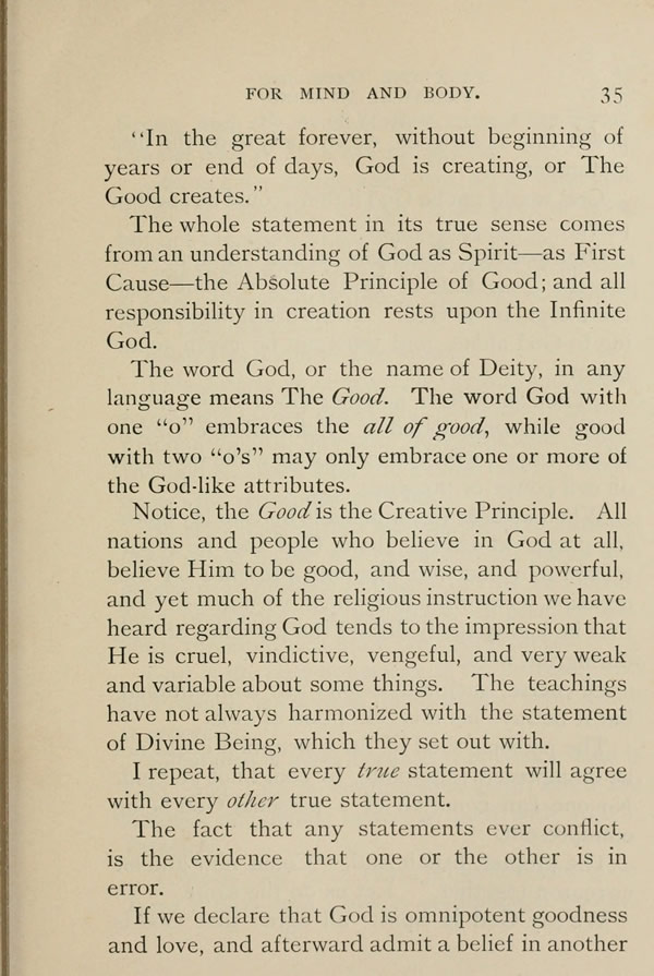 Notice, the Good is the Creative Principle. All nations and people who believe in God at all, believe Him to be good, and wise, and powerful, and yet much of the religious instruction we have heard regarding God tends to the impression that He is cruel, vindictive, vengeful, and very weak and variable about some things. The teachings have not always harmonized with the statement of Divine Being, which they set out with.