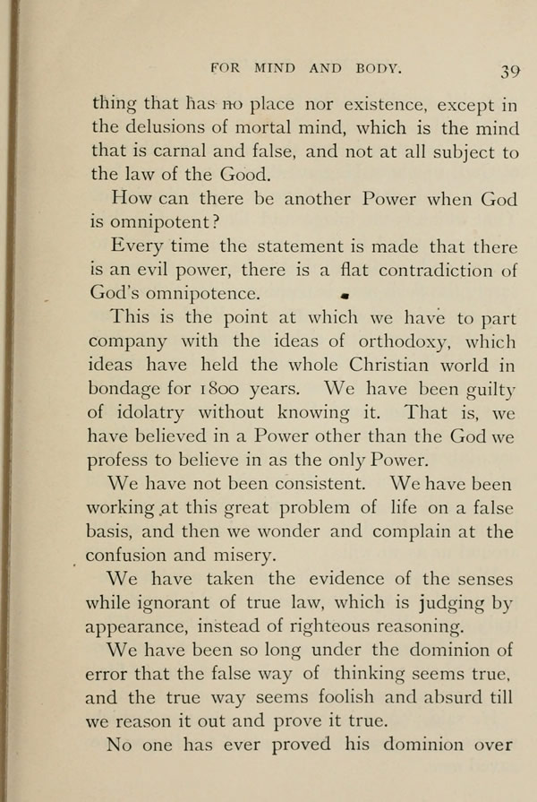 This is the point at which we have to part company with the ideas of orthodoxy, which ideas have held the whole Christian world in bondage for 1800 years. We have been guilty of idolatry without knowing it. That is, we have believed in a Power other than the God we profess to believe in as the only Power.