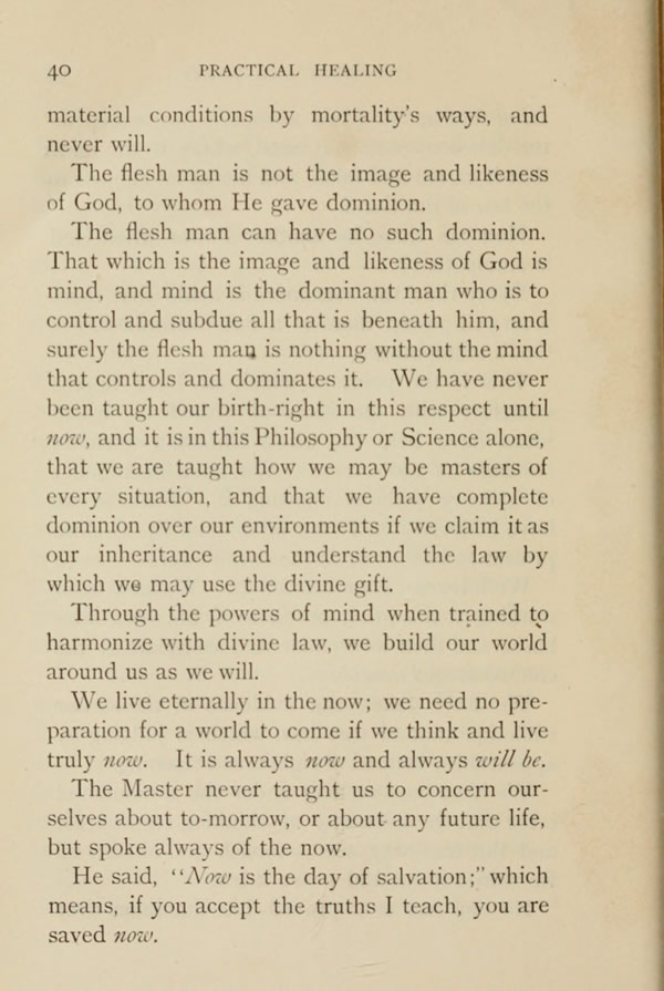 The flesh man can have no such dominion. That which is the image and likeness of God is mind, and mind is the dominant man who is to control and subdue all that is beneath him, and surely the flesh man is nothing without the mind that controls and dominates it. We have never been taught our birth-right in this respect until now, and it is in this Philosophy or Science alone, that we are taught how we may be masters of every situation, and that we have complete dominion over our environments if we claim it as our inheritance and understand the law by which we may use the divine gift.
