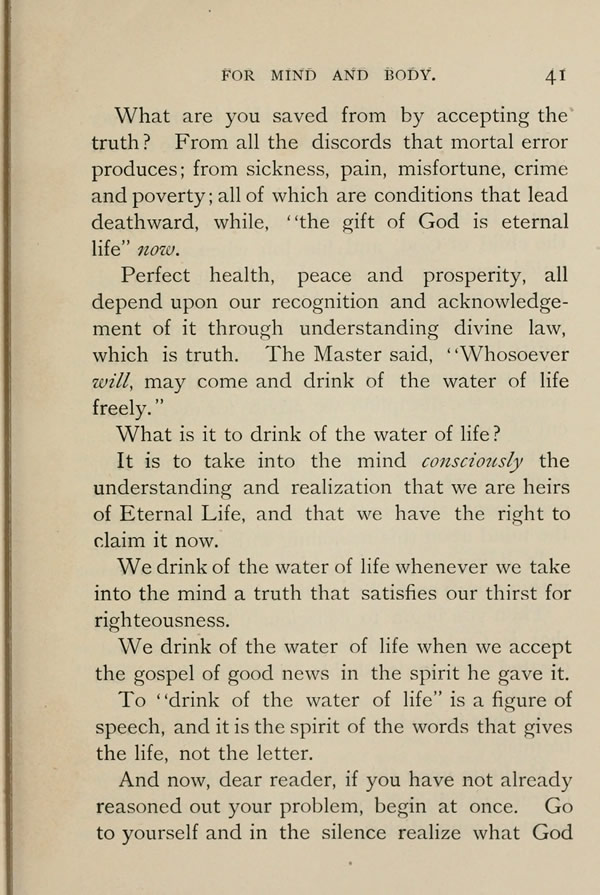 Perfect health, peace and prosperity, all depend upon our recognition and acknowledgment of it through understanding divine law, which is truth. The Master said, "Whosoever will, may come and drink of the water of life freely."