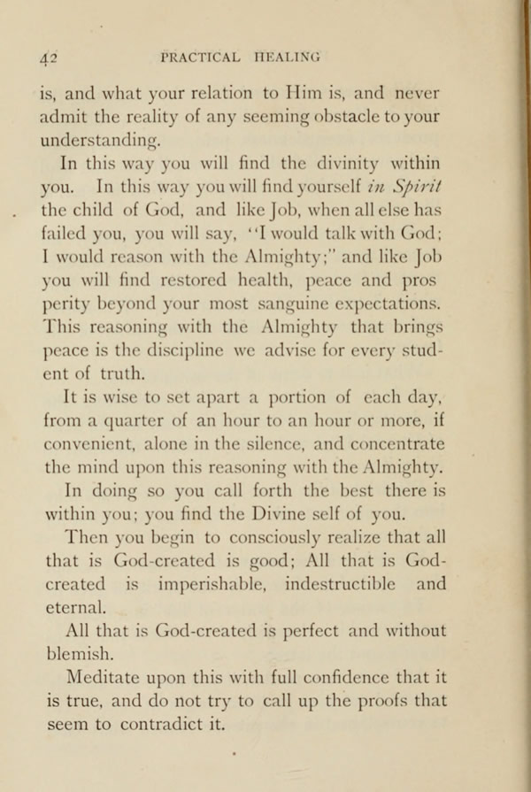 In this way you will find the divinity within you. In this way you will find yourself in Spirit the child of God, and like Job, when all else has failed you, you will say, "I would talk with God; I would reason with the Almighty;" and like Job you will find restored health, peace and prosperity beyond your most sanguine expectations. This reasoning with the Almighty that brings peace is the discipline we advise for every student of truth.
