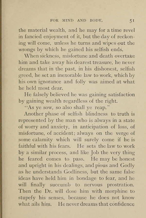 He may be honest and upright in his dealings, and pious and Godly as he understands Godliness, but the same false ideas have held him in bondage to fear, and he will finally succumb to nervous prostration. Then the doctor will dose him with morphine to stupefy his senses, because he does not know what ails him. He never dreams that confidence