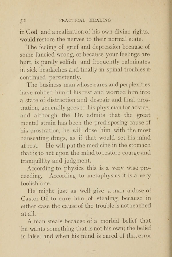 The business man whose cares and perplexities have robbed him of his rest and worried him into a state of distraction and despair and final prostration, generally goes to his physician for advice, and although the doctor admits that the great mental strain has been the predisposing cause of his prostration, he will dose him with the most nauseating drugs, as if that would set his mind at rest. He will put the medicine in the stomach that is to act upon the mind to restore courage and tranquility and judgment.