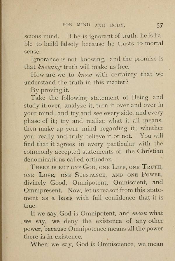 There is but one God, one Life, one Truth, one Love, one Substance, and one Power, divinely Good, Omnipotent, Omniscient, and Omnipresent.
