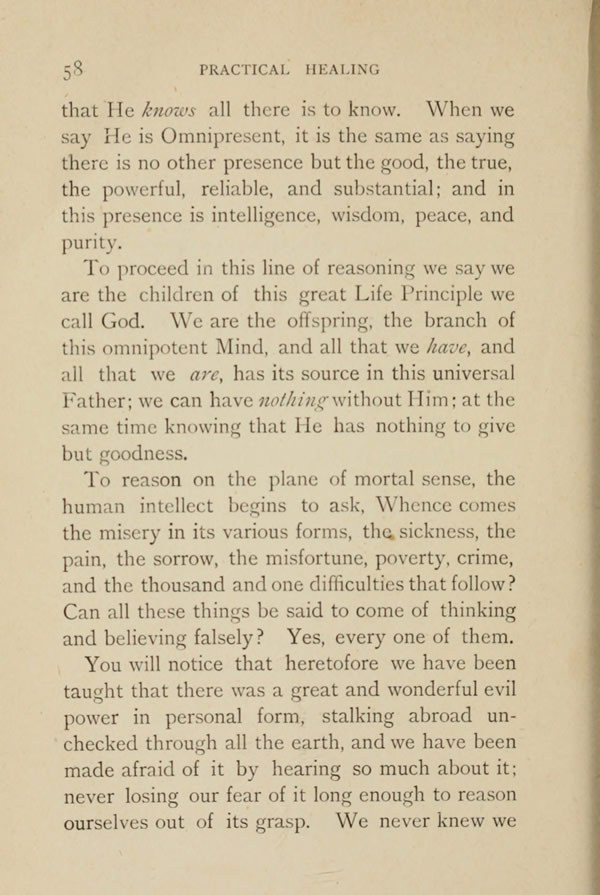 You will notice that heretofore we have been taught that there was a great and wonderful evil power in personal form, stalking abroad unchecked through all the earth, and we have been made afraid of it by hearing so much about it; never losing our fear of it long enough to reason ourselves out of its grasp. We never knew we