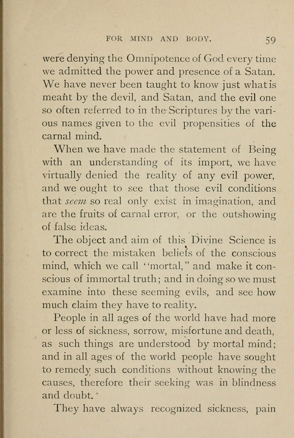 The object and aim of this Divine Science is to correct the mistaken beliefs of the conscious mind, which we call "mortal," and make it conscious of immortal truth; and in doing so we must examine into these seeming evils, and see how much claim they have to reality.