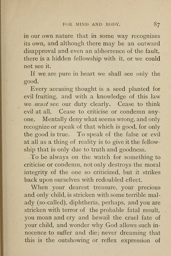 To be always on the watch for something to criticize or condemn, not only destroys the moral integrity of the one so criticized, but it strikes back upon ourselves with redoubled effect. When your dearest treasure, your precious and only child, is stricken with some terrible malady (so-called), diphtheria, perhaps, and you are stricken with terror of the possible fatal result, you moan and cry and bewail the cruel fate of your child, and wonder why God allows such innocence to suffer and die; never dreaming that this is the outshowing or reflex expression of