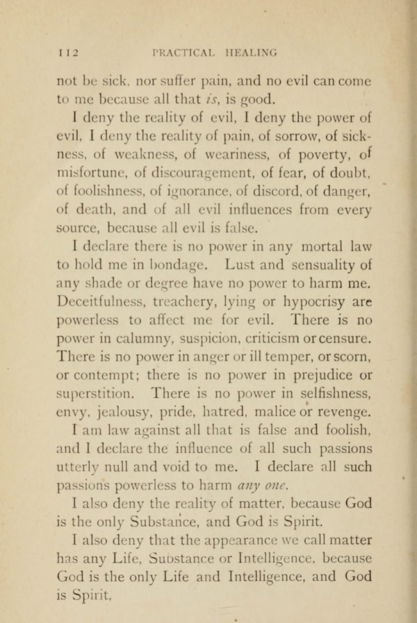 be sick, nor suffer pain, and no evil can come to me because all that is, is good. I deny the reality of evil, I deny the power of evil, I deny the reality of pain, of sorrow, of sickness, of weakness, of weariness, of poverty, of misfortune, of discouragement, of fear, of doubt, of foolishness, of ignorance, of discord, of danger, of death, and of all evil influences from every source, because all evil is false.