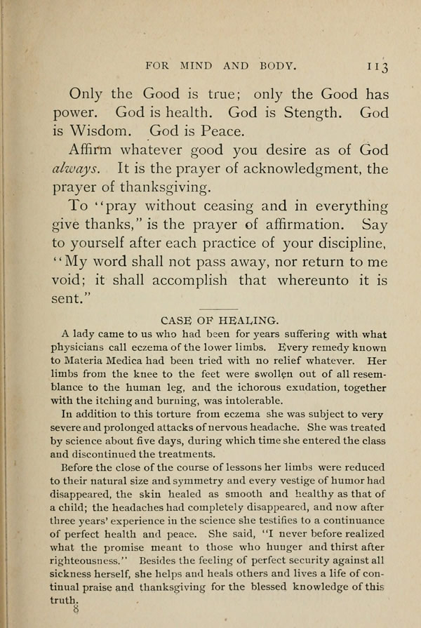 Before the close of the course of lessons her limbs were reduced to their natural size and symmetry and every vestige of humor had disappeared, the skin healed as smooth and healthy as that of a child; the headaches had completely disappeared, and now after three years experience in the science she testifies to a continuance of perfect health and peace. She said, "I never before realized what the promise meant to those who hunger and thirst after righteousness." Besides the feeling of perfect security against all sickness herself, she helps and heals others and lives a life of continual praise and thanksgiving for the blessed knowledge of this truth.