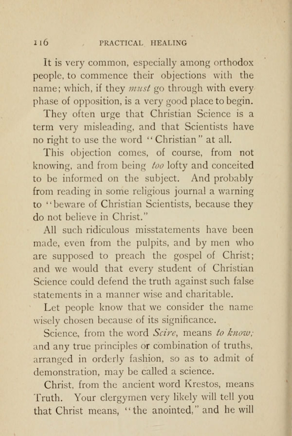 That which distinguishes the Science of Mind from the cold material sciences of mathematics, chemistry, astronomy, etc., is the predominance of the love principle, which heals, comforts, and blesses. The material sciences may very reasonably be called divinely true, because they are based upon true principles, and yet they lack the Life and Love that rounds out the complete Science of all sciences, which embraces all truth, and which will serve the race in the solution of every problem when people fully comprehend that the gospel of Christ is scientific. Science, from the word Scire, means to know; and any true principles or combination of truths, arranged in orderly fashion, so as to admit of demonstration, may be called a science. Christ, from the ancient word Krestos, means Truth. Your clergymen very likely will tell you that Christ means, "the anointed," and he will