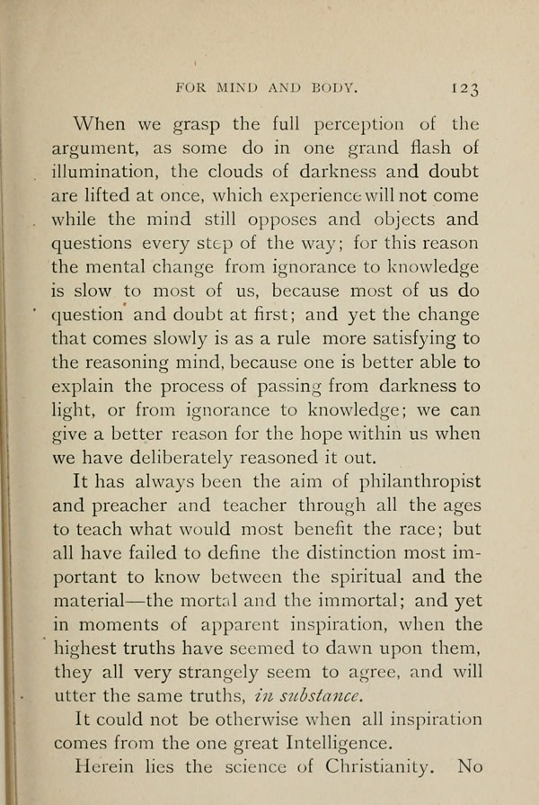 When we grasp the full perception of the argument, as some do in one grand flash of illumination, the clouds of darkness and doubt are lifted at once, which experience will not come while the mind still opposes and objects and questions every step of the way; for this reason the mental change from ignorance to knowledge is slow to most of us, because most of us do question and doubt at first; and yet the change that comes slowly is as a rule more satisfying to the reasoning mind, because one is better able to explain the process of passing from darkness to light, or from ignorance to knowledge; we can give a better reason for the hope within us when we have deliberately reasoned it out.