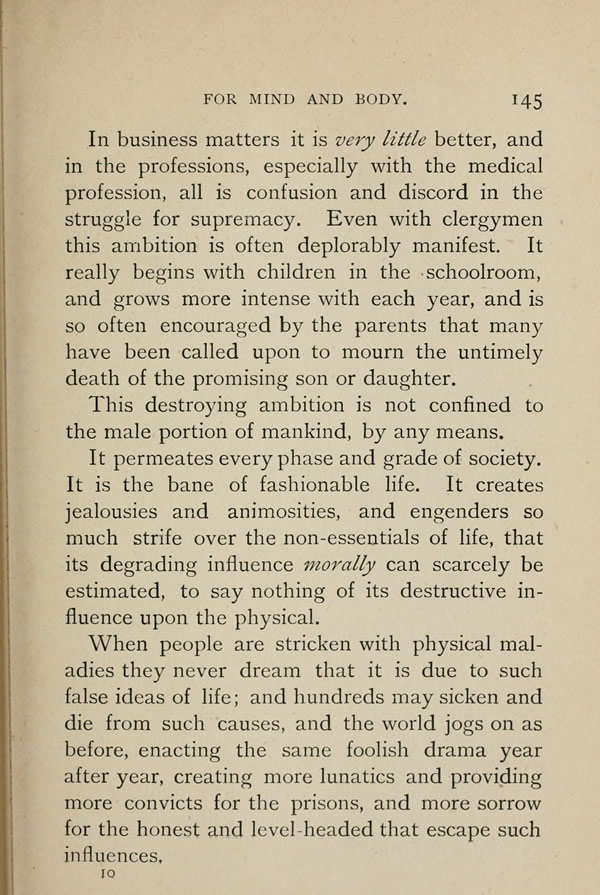 In business matters it is very little better, and in the profession, especially with the medical profession, all is confusion and discord in the struggle for supremacy. Even with clergymen this ambition is often deplorably manifest. It really begins with children in the schoolroom, and grows more intense with each year, and is so often encouraged by the parents that many have been called upon to mourn the untimely death of the promising son or daughter. This destroying ambition is not confined to the male portion of mankind, by any means. It permeates every phase and grade of society. It is the bane of fashionable life. It creates jealousies and animosities, and engenders so much strife over the non-essentials of life, that its degrading influence morally can scarcely be estimated, to say nothing of its destructive influence upon the physical.