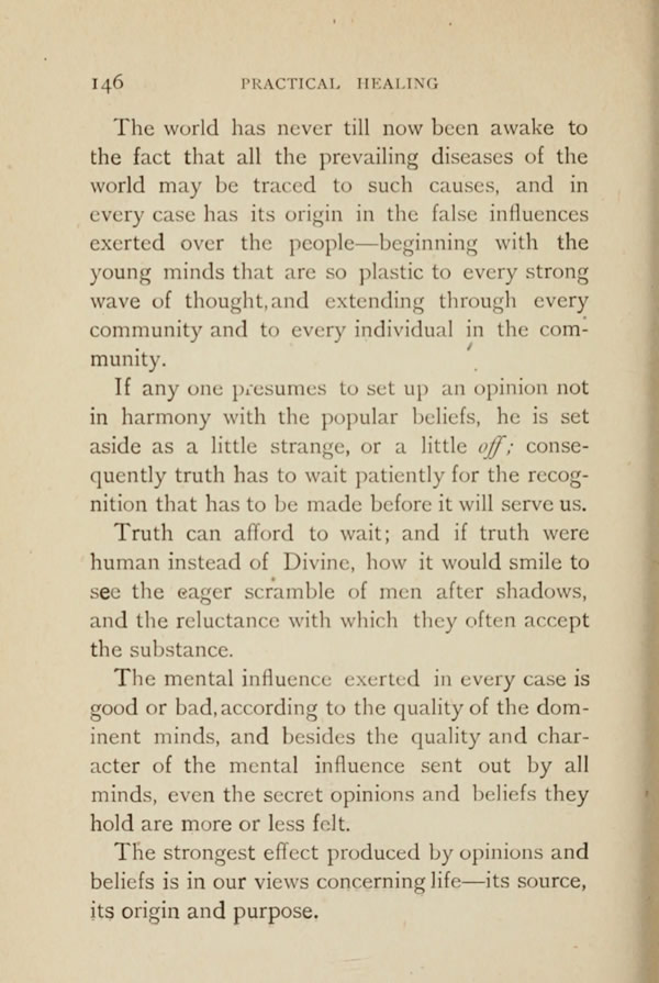 The world has never till now been awake to the fact that all the prevailing diseases of the world may be traced to such causes, and in every case has its origin in the false influences exerted over the people - beginning with the young minds that are so plastic to every strong wave of thought, and extending through every community and to every individual in the community. If any one presumes to set up an opinion not in harmony with the popular beliefs, he is set aside as a little strange, or a little off; consequently truth has to wait patiently for the recognition that has to be made before it will serve us.
