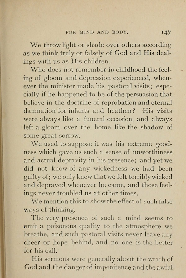 Who does not remember in childhood the feeling of gloom and depression experienced, whenever the minister made his pastoral visits; especially if he happened to be of the persuasion that believe in the doctrine of reprobation and eternal damnation for infants and heathen? His visits were always like a funeral occasion, and always left a gloom over the home like the shadow of some great sorrow.
