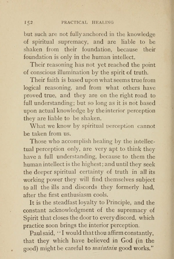 Those who accomplish healing by the intellectual perception only, are very apt to think they have a full understanding, because to them the human intellect is the highest; and until they seek the deeper spiritual certainty of truth in all its working power they will find themselves subject to all the ills and discords they formerly had, after the first enthusiasm cools.