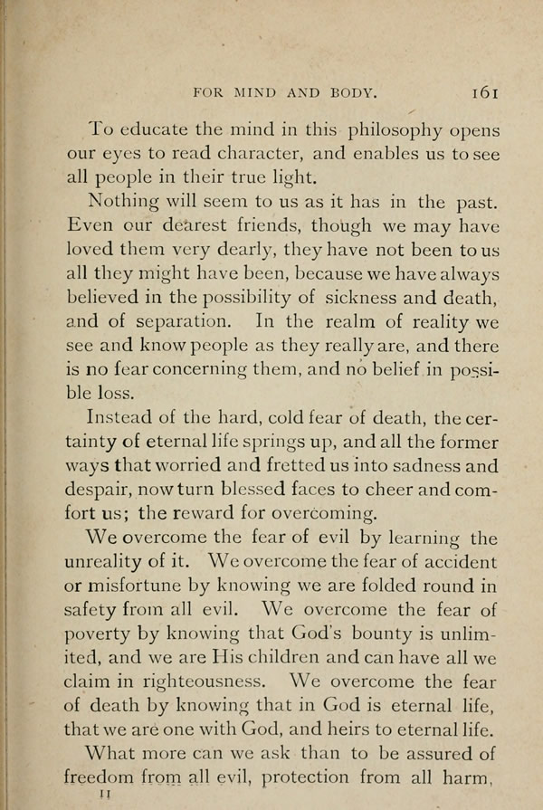 We overcome the fear of evil by learning the unreality of it. We overcome the fear of accident or misfortune by knowing we are folded round in safety from all evil. We overcome the fear of poverty by knowing that God's bounty is unlimited, and we are His children and can have all we claim in righteousness. We overcome the fear of death by knowing that in God is eternal life, that we are one with God, and heirs to eternal life.