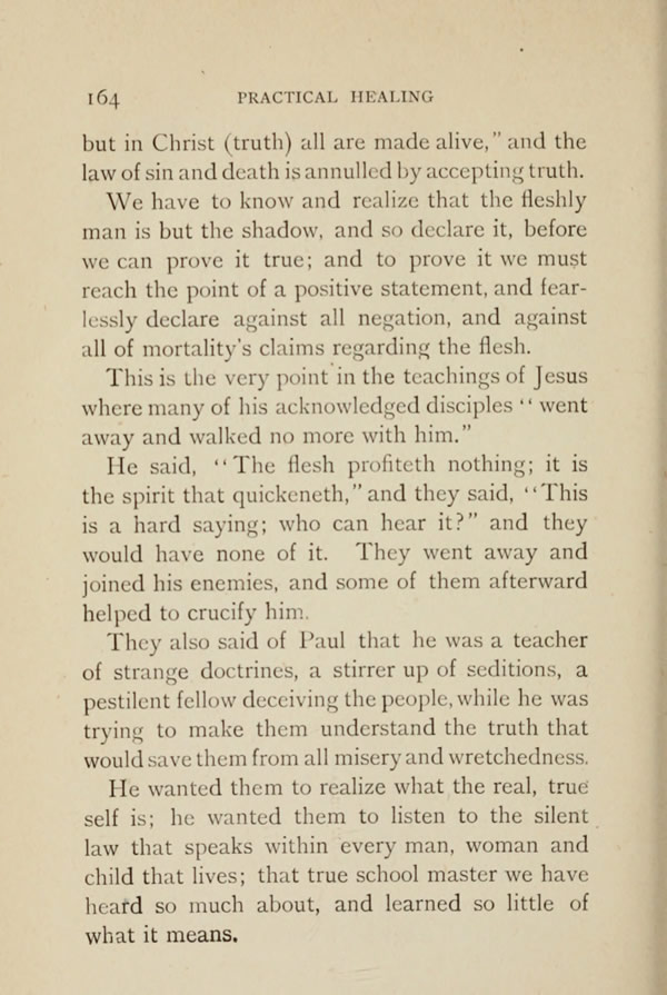 We have to know and realize that the fleshly man is but the shadow, and so declare it, before we can prove it true; and to prove it we must reach the point of a positive statement, and fearlessly declare against all negation, and against all of mortality's claims regarding the flesh. This is the very point in the teachings of Jesus where many of his acknowledged disciples "went away and walked no more with him."
