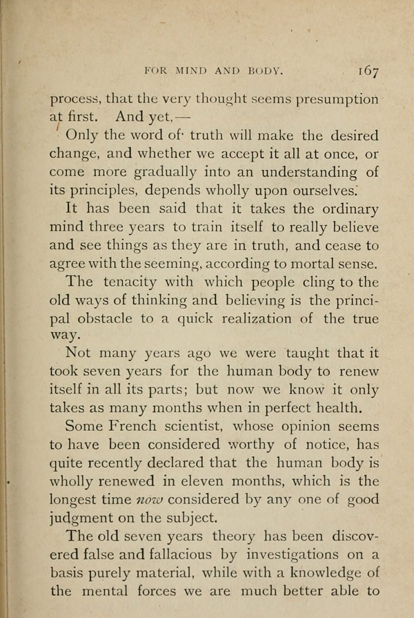 process, that the very thought seems presumption at first. And yet,- Only the word of truth will make the desired change, and whether we accept it all at once, or come more gradually into an understanding of its principles, depends wholly upon ourselves. It has been said that it takes the ordinary mind three years to train itself to really believe and see things as they are in truth, and cease to agree with the seeming, according to mortal sense. The tenacity with which people cling to the old ways of thinking and believing is the principal obstacle to a quick realization of the true way.