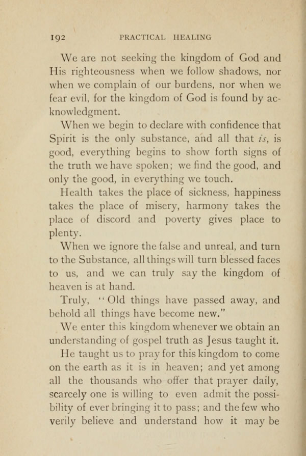 When we ignore the false and unreal, and turn to the Substance, all things will turn blessed faces to us, and we can truly say the kingdom of heaven is at hand.