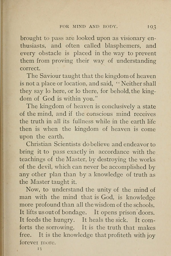 By the practice of Science we endeavor to bring it to pass exactly in accordance with the teachings of the Master, by destroying the works of the devil, which can never be accomplished by any other plan than by a knowledge of truth as the Master taught it.