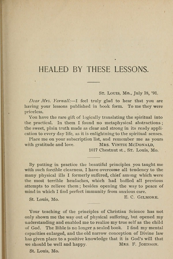 Your teaching of the principles of Christian Science has not only shown me the way out of physical suffering, but opened my understanding and enabled me to realize my true self as the child of God. The Bible is no longer a sealed book. I find my mental capacities enlarged, and the old narrow conception of Divine law has given place to a positive knowledge that it is God's will that we should be well and happy.
