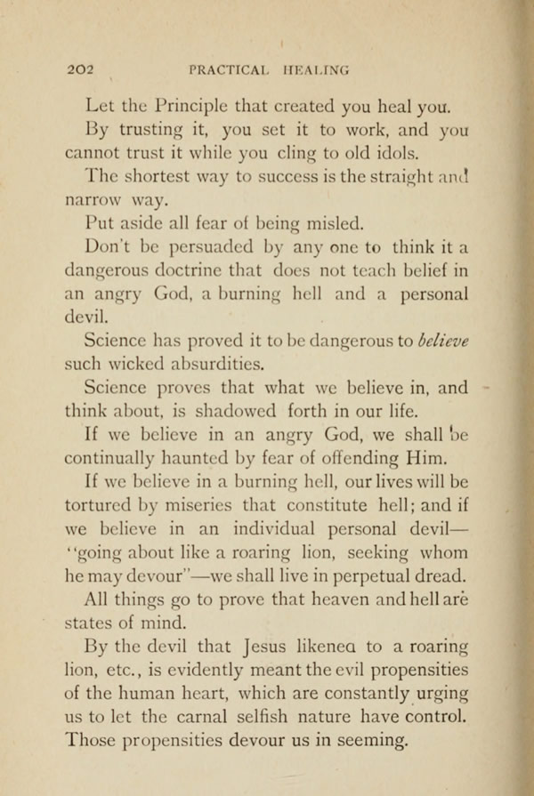 Science proves that what we believe in, and think about, is shadowed forth in our life. If we believe in an angry God, we shall be continually haunted by fear of offending Him. If we believe in a burning hell, our lives will be tortured by miseries that constitute hell; and if we believe in an individual personal devil - "going about like a roaring lion, seeking whom he may devour" - we shall live in perpetual dread.