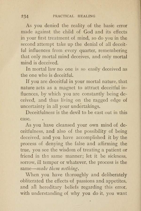 As you denied the reality of the basic error made against the child of God and its effects in your first treatment of mind, so do you in the second attempt take up the denial of all deceitful influences from every quarter, remembering that only mortal mind deceives, and only mortal mind is deceived.