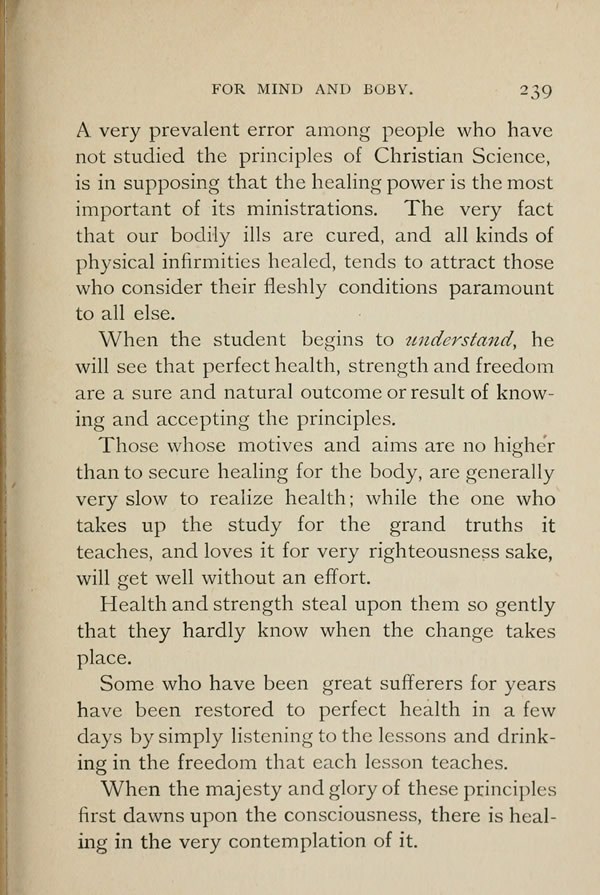 When the student begins to understand, he will see that perfect health, strength and freedom are a sure and natural outcome or result of knowing and accepting the principles. Those whose motives and aims are no higher than to secure healing for the body, are generally very slow to realize health; while the one who takes up the study for the grand truths it teaches, and loves it for very righteousness sake, will get well without an effort. Health and strength steal upon them so gently that they hardly know when the change takes place.