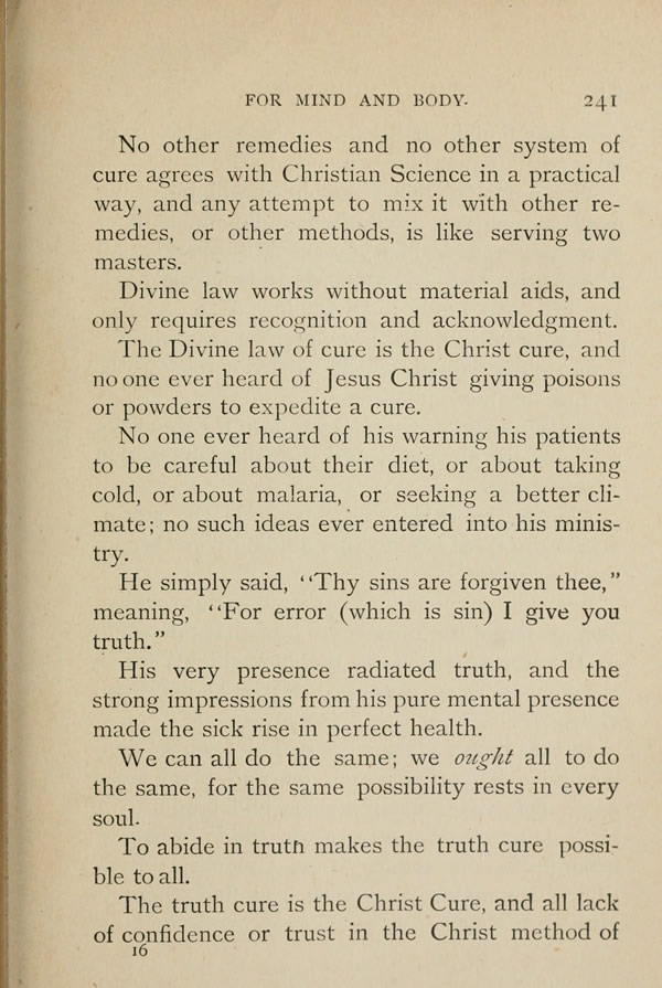 The Divine law of cure is the Christ cure, and no one ever heard of Jesus Christ giving poisons or powders to expedite a cure.