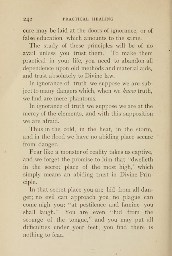 cure may be laid at the doors of ignorance, or of false education, which amounts to the same. The study of these principles will be of no avail unless you trust them. To make them practical in your life, you need to abandon all dependence upon old methods and material aids, and trust absolutely to Divine law.