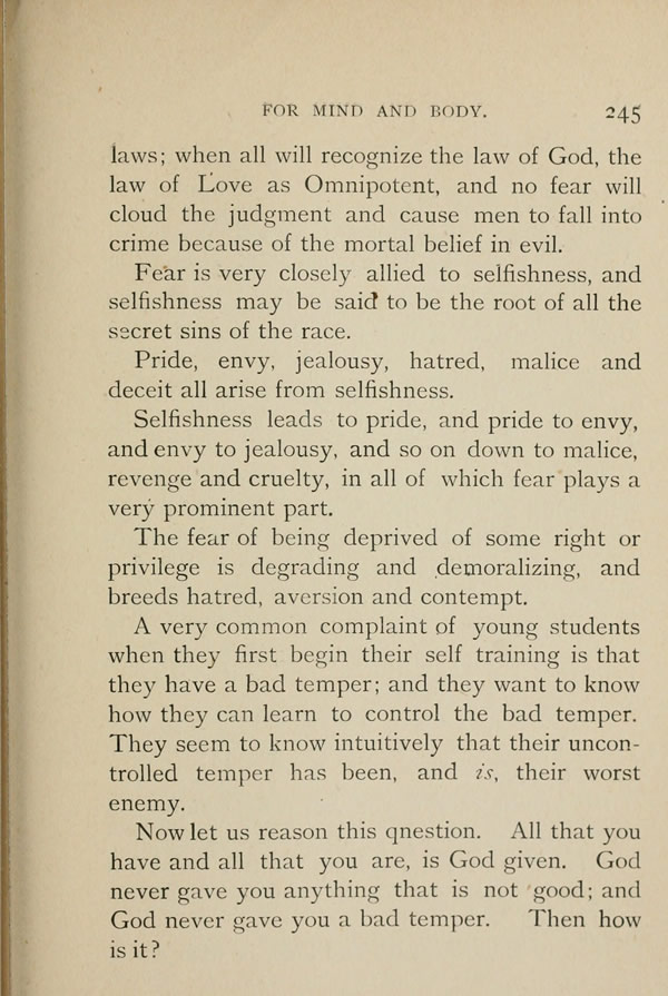 Pride, envy, jealousy, hatred, malice and deceit all arise from selfishness. Selfishness leads to pride, and pride to envy, and envy to jealousy, and so on down to malice, revenge and cruelty, in all of which fear plays a very prominent part.