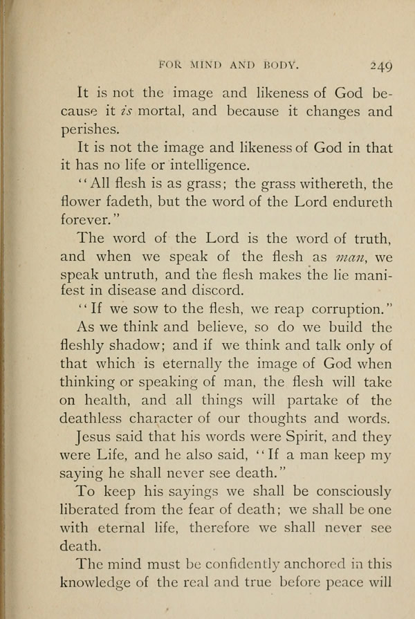 As we think and believe, so do we build the fleshly shadow; and if we think and talk only of that which is eternally the image of God when thinking or speaking of man, the flesh will take on health, and all things will partake of the deathless character of our thoughts and words. Jesus said that his words were Spirit, and they were Life, and he also said, "If a man keep my saying he shall never see death."