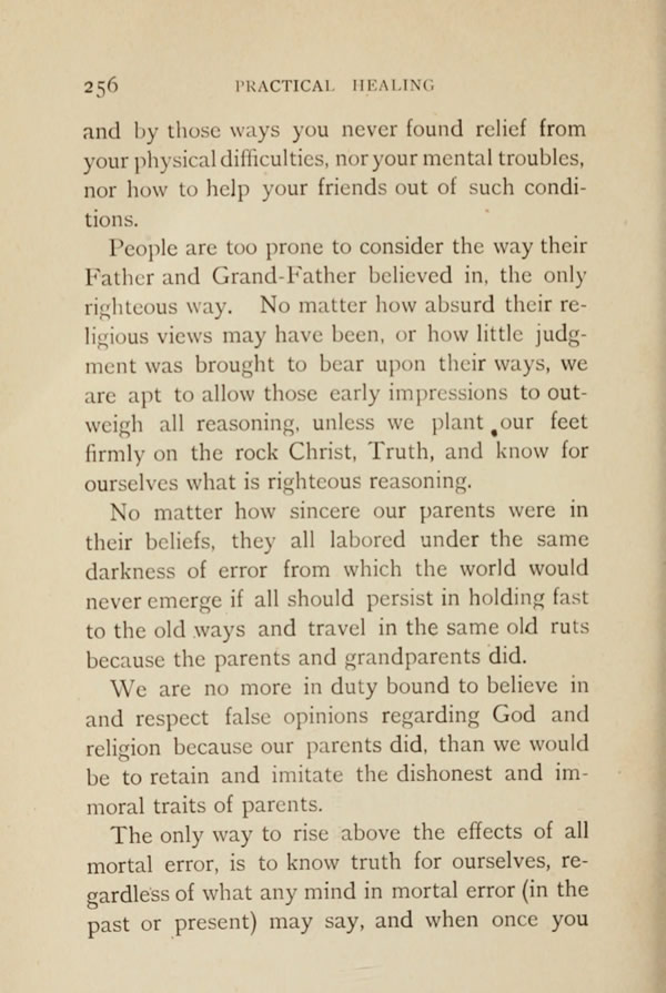 and by those ways you never found relief from your physical difficulties, nor your mental troubles, nor how to help your friends out of such conditions. People are too prone to consider the way their father and grandfather believed in, the only righteous way. No matter how absurd their religious views may have been, or how little judgment was brought to bear upon their ways, we are apt to allow those early impressions to outweigh all reasoning, unless we plant our feet firmly on the rock Christ, Truth, and know for ourselves what is righteous reasoning.