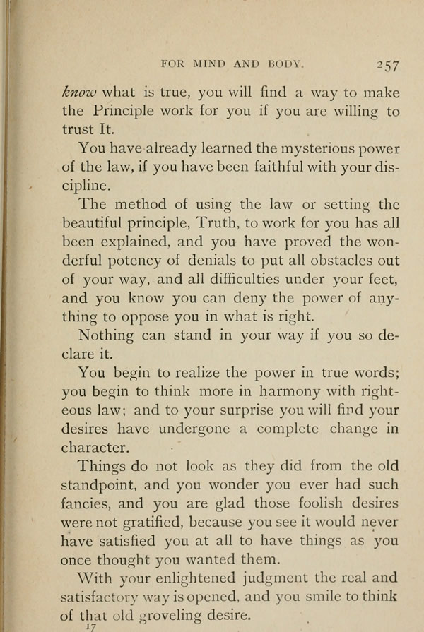 The method of using the law or setting the beautiful principle, Truth, to work for you has all been explained, and you have proved the wonderful potency of denials to put all obstacles out of your way, and all difficulties under your feet, and you know you can deny the power of anything to oppose you in what is right.