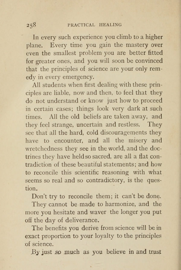 All students when first dealing with these principles are liable, now and then, to feel that they do not understand or know just how to proceed in certain cases; things look very dark at such times. All the old beliefs are taken away, and they feel strange, uncertain and restless. They see that all the hard, cold discouragements they have to encounter, and all the misery and wretchedness they see in the world, and the doctrines they have held so sacred, are all a flat contradiction of these beautiful statements; and how to reconcile this scientific reasoning with what seems so real and so contradictory, is the question.