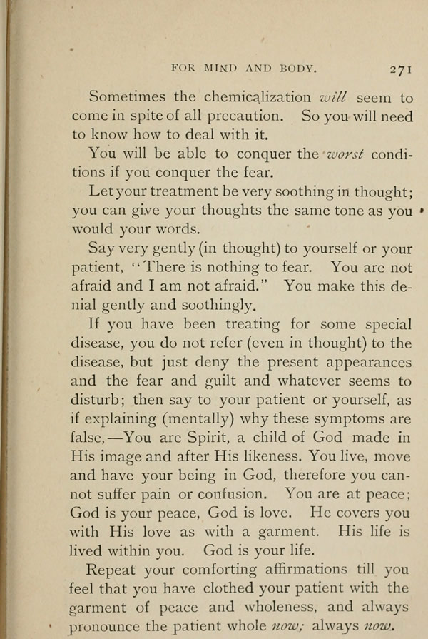 Repeat your comforting affirmations till you feel that you have clothed your patient with the garment of peace and wholeness, and always pronounce the patient whole now; always now.