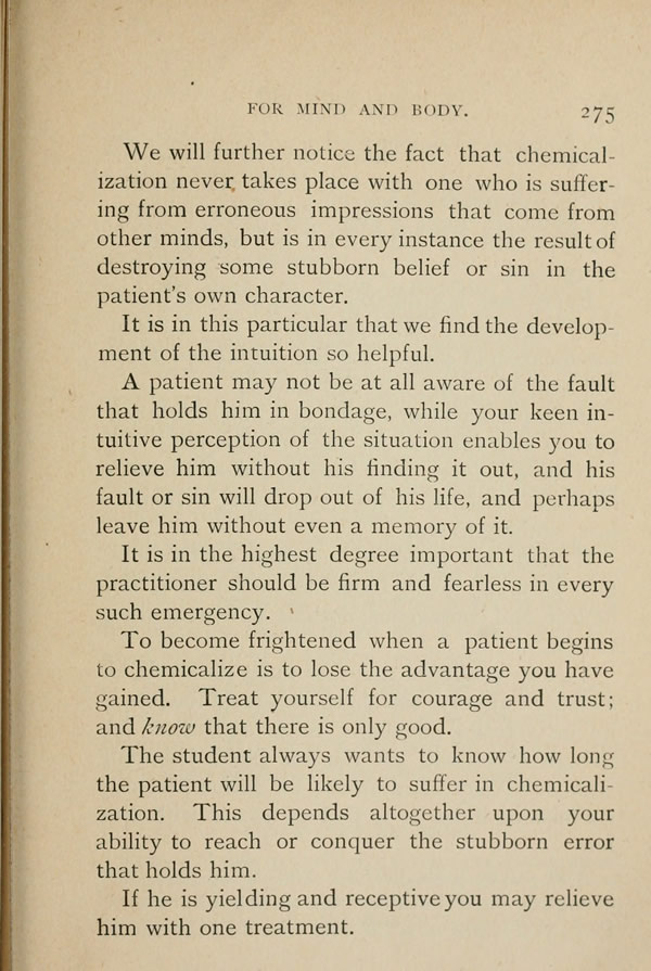 To become frightened when a patient begins to chemicalize is to lose the advantage you have gained. Treat yourself for courage and trust; and know that there is only good. The student always wants to know how long the patient will be likely to suffer in chemicalization. This depends altogether upon your ability to reach or conquer the stubborn error that holds him.