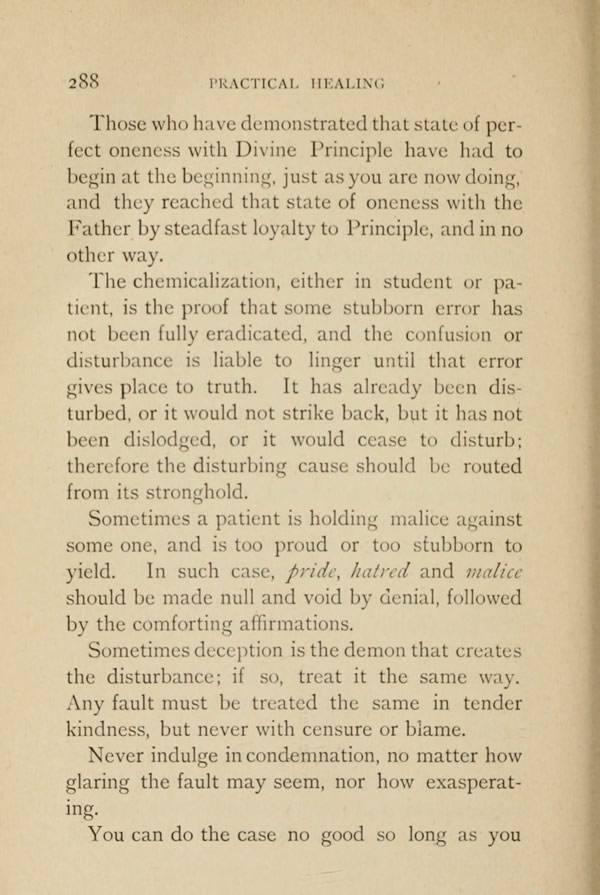 Sometimes a patient is holding malice against some one, and is too proud or too stubborn to yield. In such case, pride, hatred and malice should be made null and void by denial, followed by the comforting affirmations.