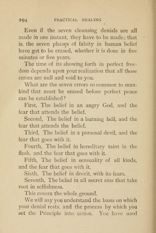 Even if the seven cleansing denials are all made in one instant, they have to be made; that is, the seven phases of falsity in human belief have got to be erased, whether it is done in five minutes or five years.