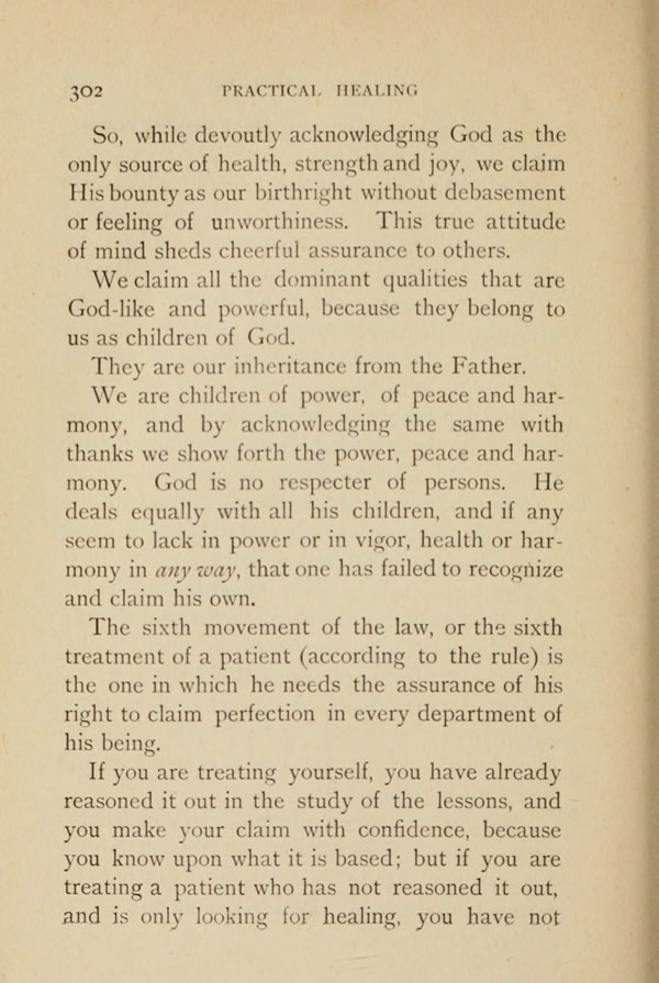 If you are treating yourself, you have already reasoned it out in the study of the lessons, and you make your claim with confidence, because you know upon what it is based; but if you are treating a patient who has not reasoned it out, and is only looking for healing, you have not