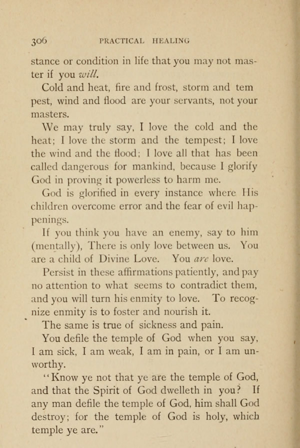 If you think you have an enemy, say to him (mentally), There is only love between us. You are a child of Divine Love. You are love. Persist in these affirmations patiently, and pay no attention to what seems to contradict them, and you will turn his enmity to love. To recognize enmity is to foster and nourish it.