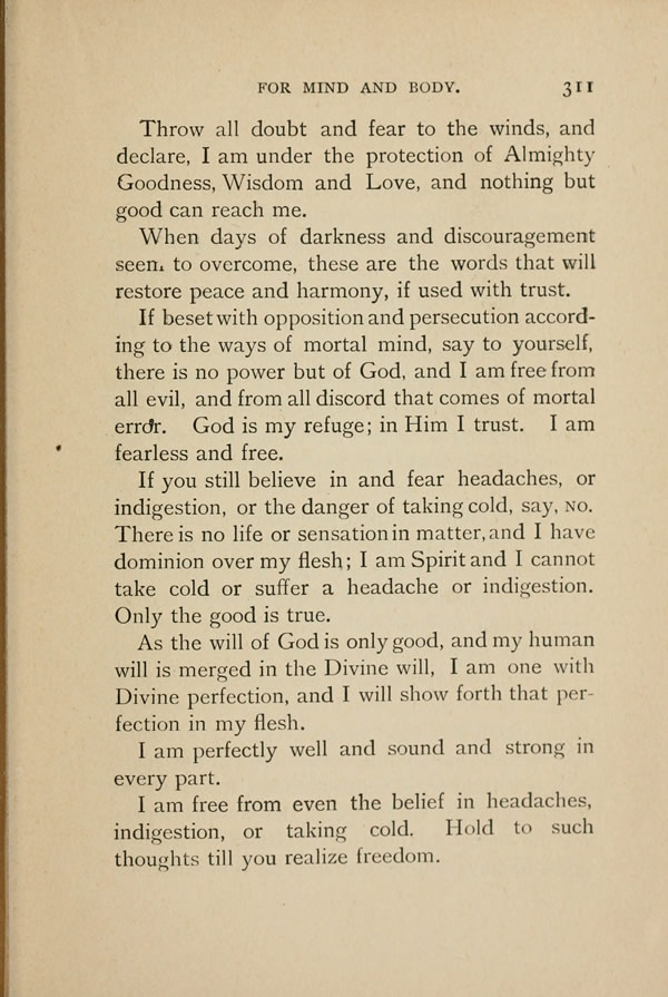 If you still believe in and fear headaches, or indigestion, or the danger of taking cold, say, NO. There is no life or sensation in matter, and I have dominion over my flesh; I am Spirit and I cannot take cold or suffer a headache or indigestion. Only the good is true.