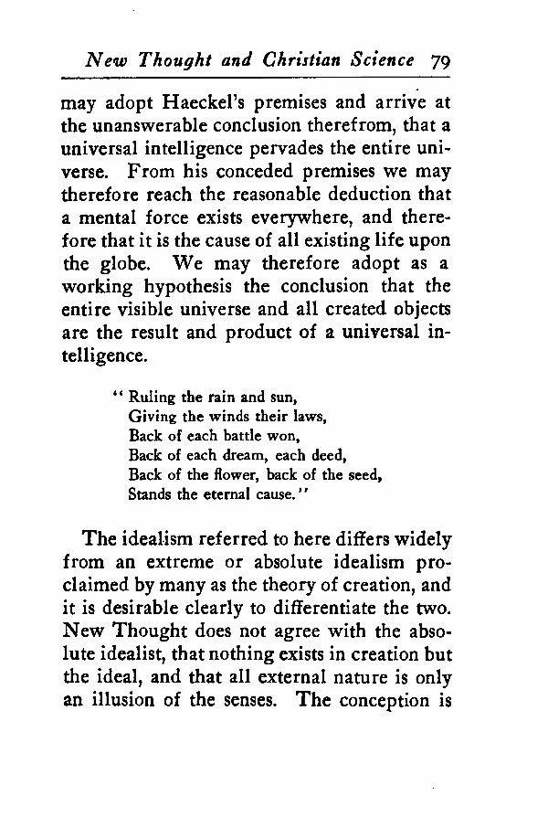 may adopt Haeckel's premises and arrive at the unanswerable conclusion therefrom, that a universal intelligence pervades the entire universe. From his conceded premises we may therefore reach the reasonable deduction that a mental force exists everywhere, and therefore that it is the cause of all existing life upon the globe. We may therefore adopt as a working hypothesis the conclusion that the entire visible universe and all created objects are the result and product of a universal intelligence.