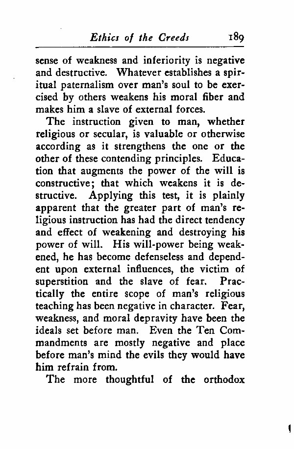 The instruction given to man, whether religious or secular, is valuable or otherwise according as it strengthens the one or the other of these contending principles. Education that augments the power of the will is constructive; that which weakens it is destructive. Applying this test, it is plainly apparent that the greater part of man's religious instruction has had the direct tendency and effect of weakening and destroying his power of will. His will-power being weakened, he has become defenseless and dependent upon external influences, the victim of superstition and the slave of fear. Practically the entire scope of man's religious teaching has been negative in character. Fear, weakness, and moral depravity have been the ideals set before man. Even the Ten Commandments are mostly negative and place before man's mind the evils they would have him refrain from.