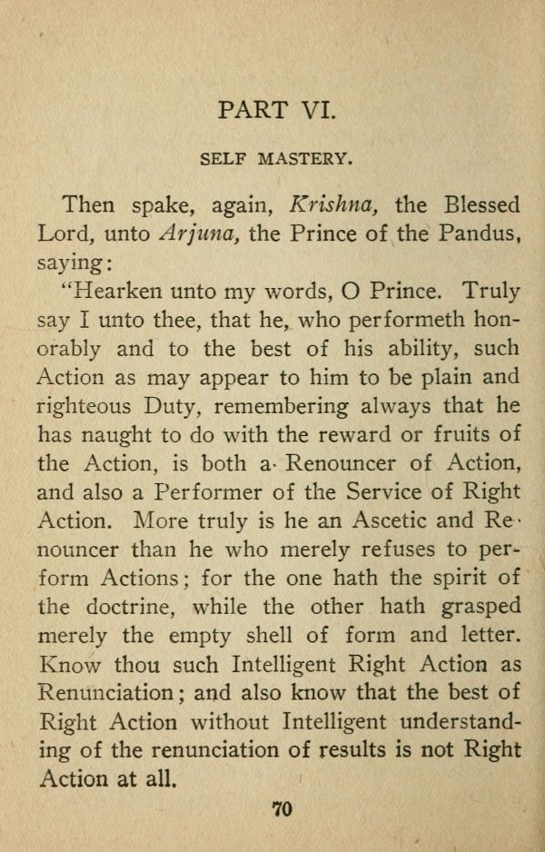 "Hearken unto my words, O Prince. Truly say I unto thee, that he, who performeth honorably and to the best of his ability, such Action as may appear to him to be plain and righteous Duty, remembering always that he has naught to do with the reward or fruits of the Action, is both a- Renouncer of Action, and also a Performer of the Service of Right Action. More truly is he an Ascetic and Renouncer than he who merely refuses to perform Actions; for the one hath the spirit of the doctrine, while the other hath grasped merely the empty shell of form and letter. Know thou such Intelligent Right Action as Renunciation; and also know that the best of Right Action without Intelligent understanding of the renunciation of results is not Right Action at all.