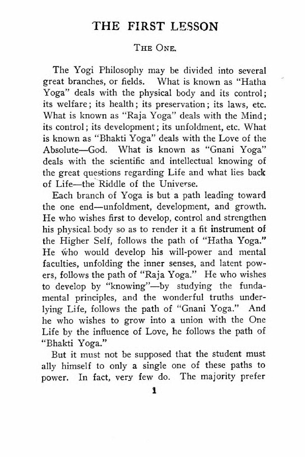 The Yogi Philosophy may be divided into several great branches, or fields. What is known as "Hatha Yoga" deals with the physical body and its control; its welfare; its health; its preservation; its laws, etc. What is known as "Raja Yoga" deals with the Mind; its control; its development; its unfoldment, etc. What is known as "Bhakti Yoga" deals with the Love of the Absolute --- God. What is known as "Gnani Yoga" deals with the scientific and intellectual knowing of the great questions regarding Life and what lies back of Life --- the Riddle of the Universe.