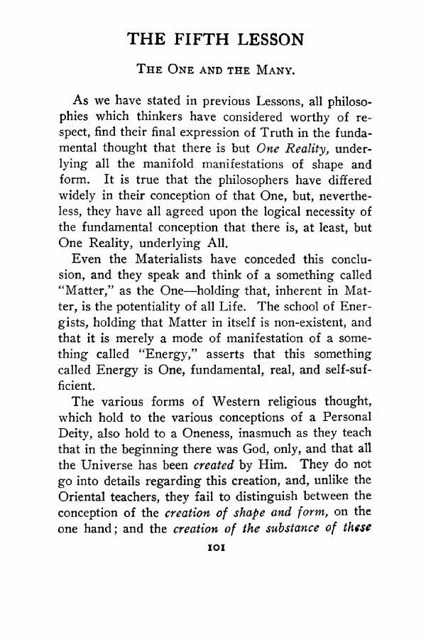 Even the Materialists have conceded this conclusion, and they speak and think of a something called "Matter," as the One --- holding that, inherent in Matter, is the potentiality of all Life. The school of Energists, holding that Matter in itself is non-existent, and that it is merely a mode of manifestation of a something called "Energy," asserts that this something called Energy is One, fundamental, real, and self-sufficient.