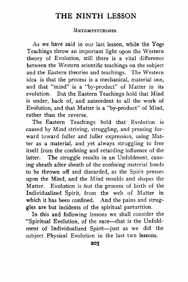 As we have said in our last lesson, while the Yogi Teachings throw an important light upon the Western theory of Evolution, still there is a vital difference between the Western scientific teachings on the subject and the Eastern theories and teachings. The Western idea is that the process is a mechanical, material one, and that "mind" is a "by-product" of Matter in its evolution. But the Eastern Teachings hold that Mind is under, back of, and antecedent to all the work of Evolution, and that Matter is a "by-product" of Mind, rather than the reverse.