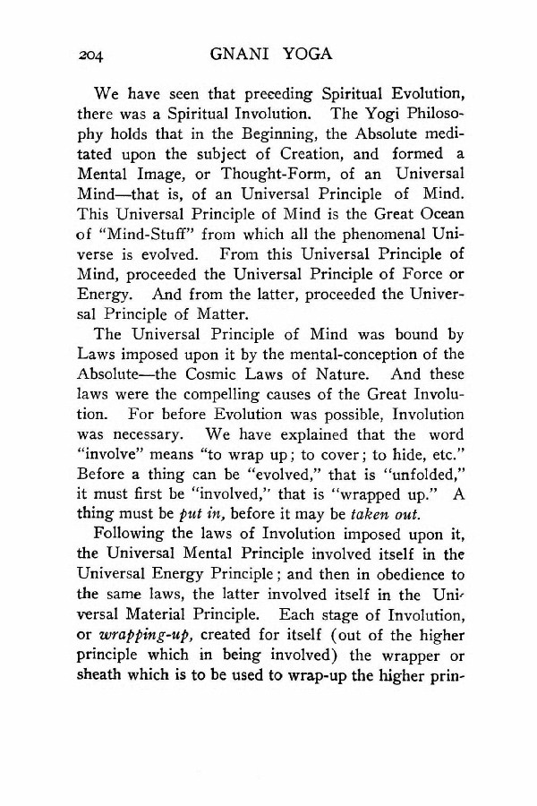 We have seen that preceding Spiritual Evolution, there was a Spiritual Involution. The Yogi Philosophy holds that in the Beginning, the Absolute meditated upon the subject of Creation, and formed a Mental Image, or Thought-Form, of an Universal Mind --- that is, of an Universal Principle of Mind. This Universal Principle of Mind is the Great Ocean of "Mind-Stuff" from which all the phenomenal Universe is evolved. From this Universal Principle of Mind, proceeded the Universal Principle of Force or Energy. And from the latter, proceeded the Universal Principle of Matter.