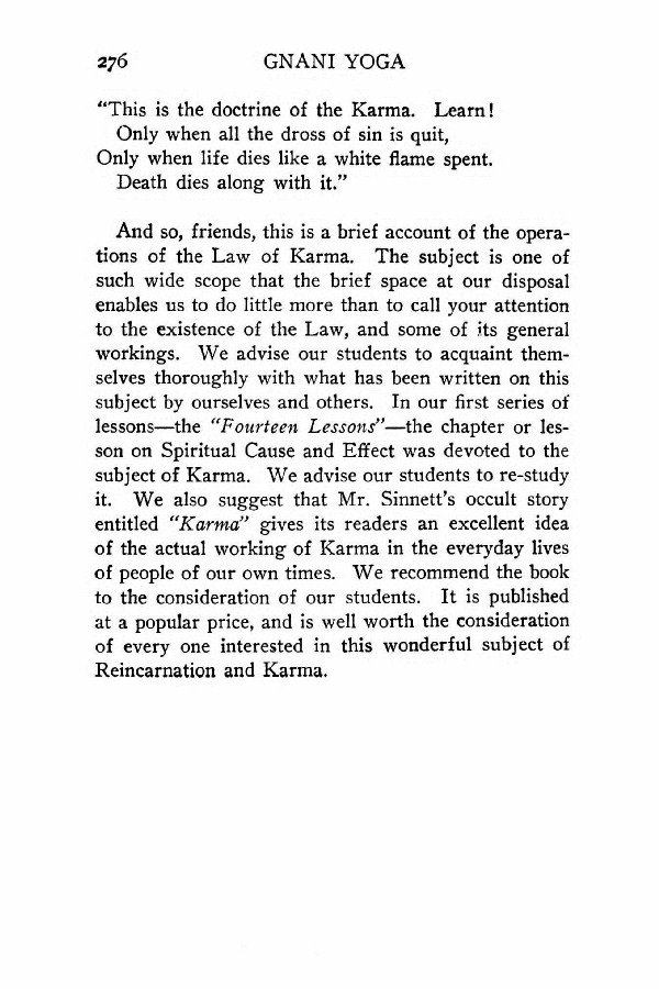 And so, friends, this is a brief account of the operations of the Law of Karma. The subject is one of such wide scope that the brief space at our disposal enables us to do little more than to call your attention to the existence of the Law, and some of its general workings. We advise our students to acquaint themselves thoroughly with what has been written on this subject by ourselves and others. In our first series of lessons --- the "Fourteen Lessons" --- the chapter or lesson on Spiritual Cause and Effect was devoted to the subject of Karma. We advise our students to re-study it. We also suggest that Mr. Sinnett's occult story entitled "Karma" gives its readers an excellent idea of the actual working of Karma in the everyday lives of people of our own times. We recommend the book to the consideration of our students. It is published at a popular price, and is well worth the consideration of every one interested in this wonderful subject of Reincarnation and Karma.